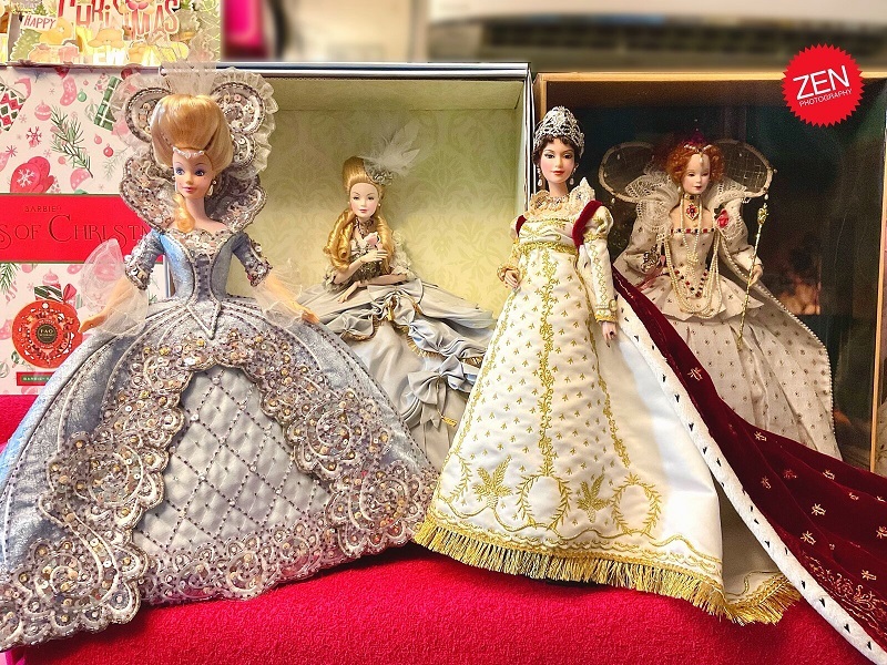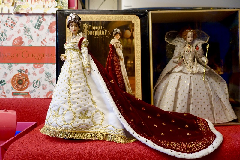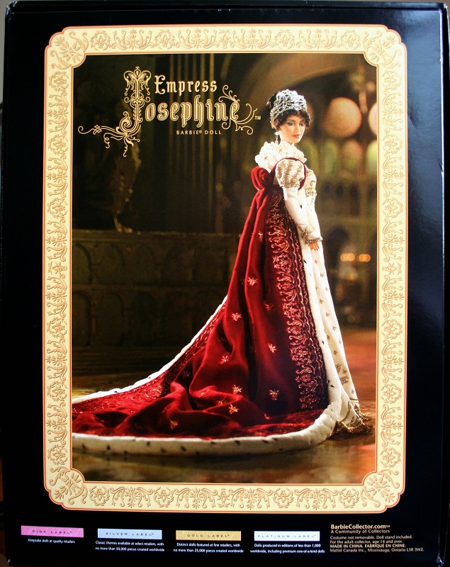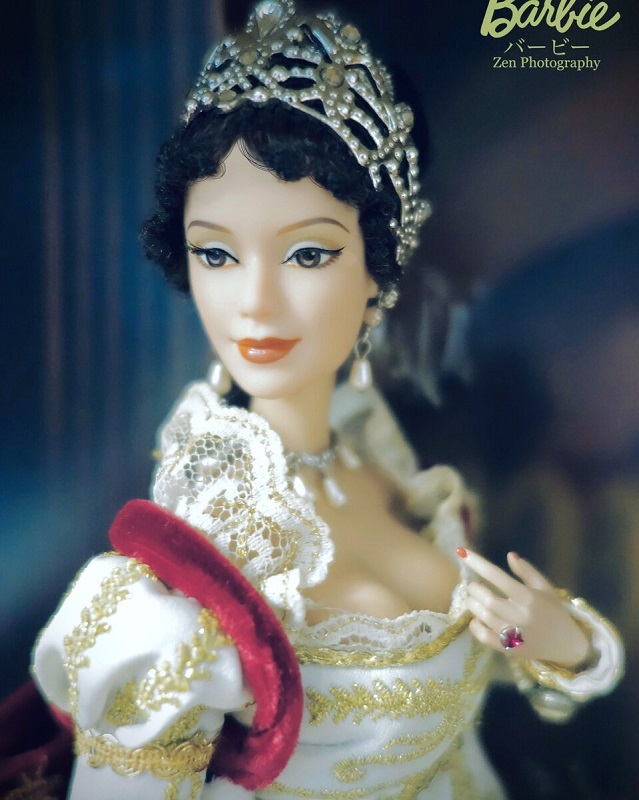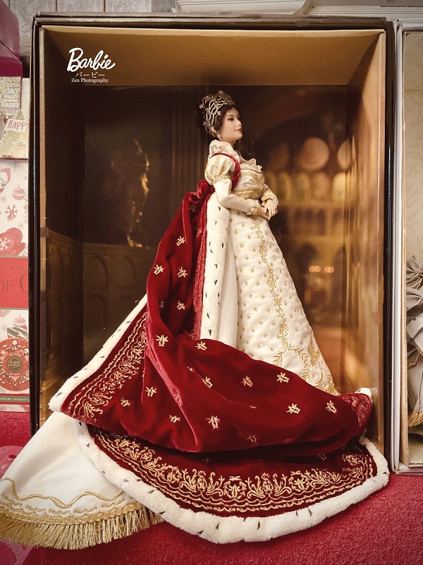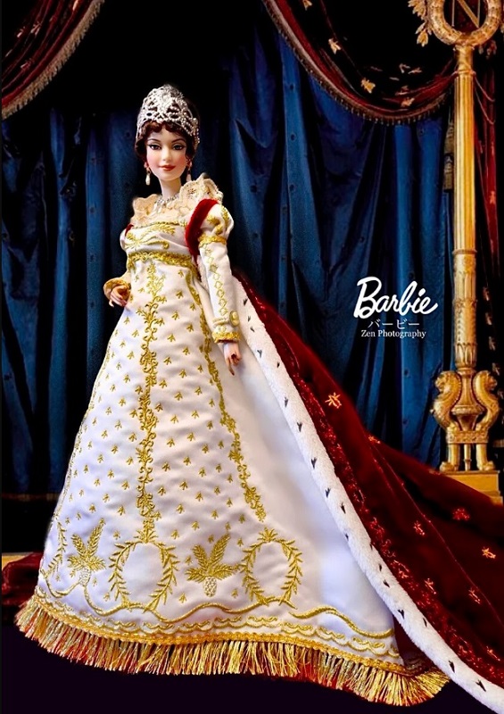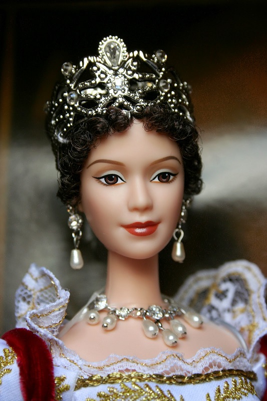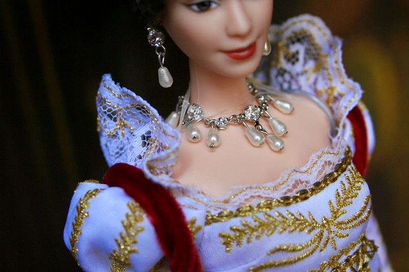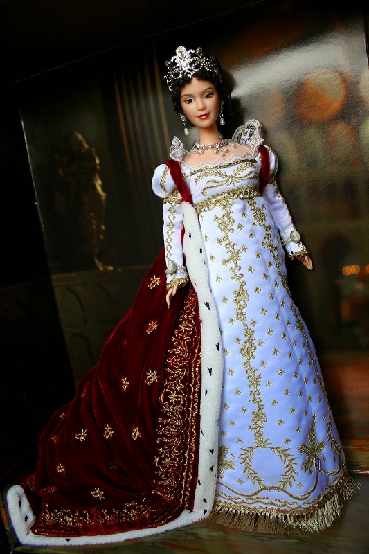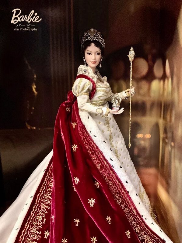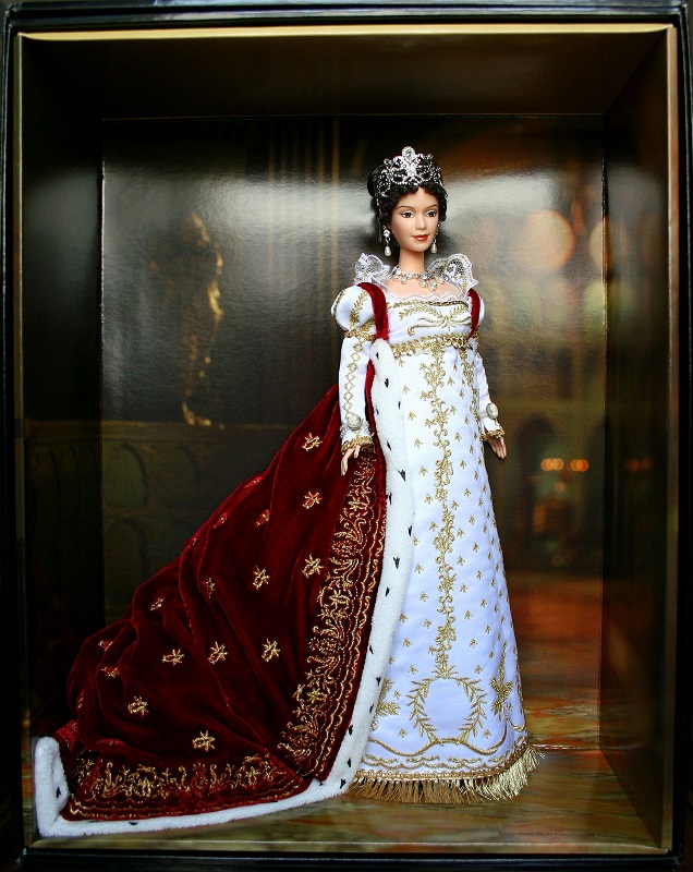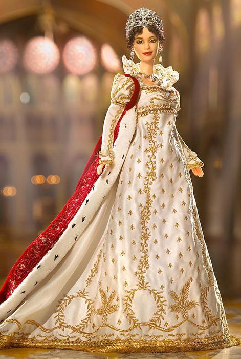 На кукле Барби необыкновенное платье в стиле ампир, сшитое из атласа и украшенное золотой тесьмой и бахромой, в сочетании с бархатным халатом насыщенного красного цвета, подбитым экстравагантным искусственным горностаем. Комплект украшений из искусственного жемчуга, а также серебристая корона и тиара с кристаллами подойдут королеве!