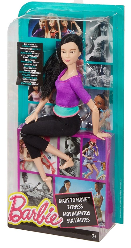 Новые куклы Барби безграничные движения (Barbie Made to Move) — новинка 2015 года, современные игровые шарнирные Барби, созданные для движения, они обожают заниматься йогой и фитнесом! Теперь Ваша новая шарнирная кукла Барби может принять позу Лотоса,с легкостью сесть на шпагат,прокатиться на игрушечном велосипеде, сложить руки на груди, сделать ласточку, прокатиться на игрушечной лошади, принять положение Мостик, делать гимнастику, как настоящий человек. У кукол 22 супер современных шарнира, которые расположены в шее, в руках, локтях (двойные шарниры), запястьях, торсе, ногах, в коленях и щиколотках. Посмотрев промо фотографии, Вы можете увидеть, какие они супер пластичные. Barbie Made to Move Fitness одеты в стильные спортивные костюмы — черные леггинсы и двухцветные топы. В серии Барби Фитнесс было выпущено 4 куколки с нежным макияжем, выполненным в пастельных тонах — блондинка (классический молд Барби), брюнетка (молд Тереза), азиатка (молд Неко) и редкая африканка (молд Шани). Куклы продаются в красивой фирменной коробке без аксессуаров и обуви. Куклы представлены в розовом, голубом, сиреневом и желтом топе (желтый топ большая редкость - очень пользуется спросом).