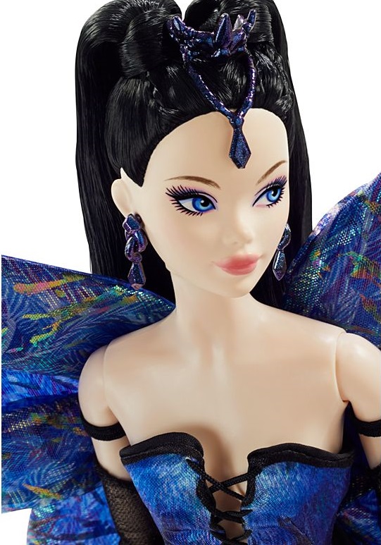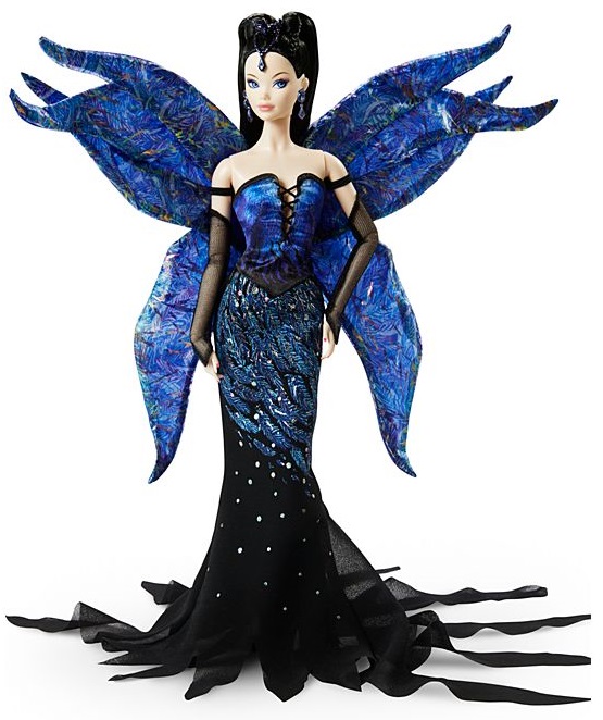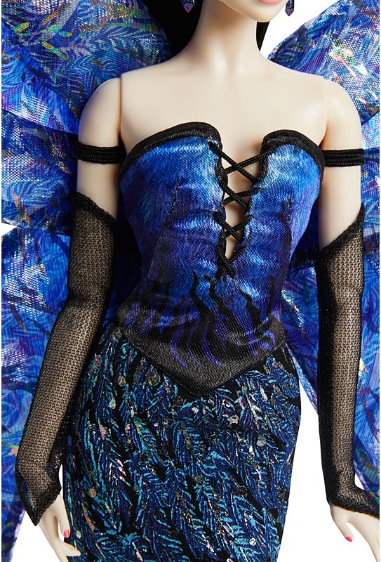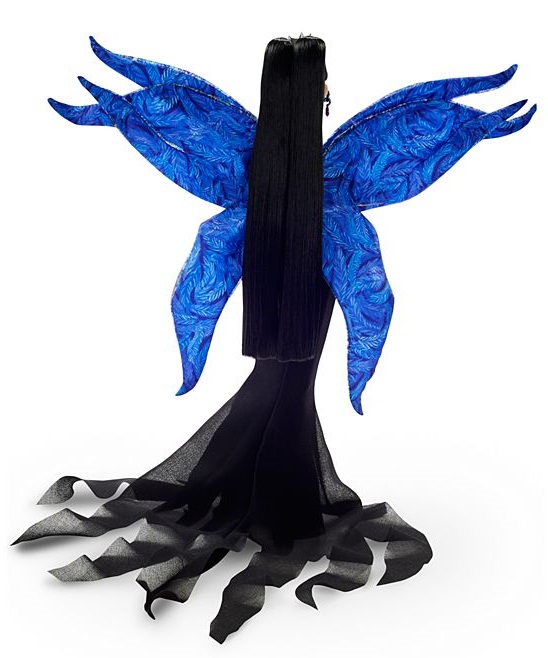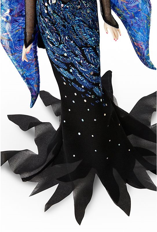 Кукла Барби "Полет Моды" имеет фантастический вид, вдохновленный крылатыми существами, реальными и воображаемыми. Она одета в эффектное платье «русалка» с перьями и мерцающими вставками. Ее длинные, угольно-черные волосы уложены в два гладких, завязанных в узел хвостика, перемежаемых очаровательным головным убором в форме слезы. Серьги-капли в тон и длинные перчатки без пальцев завершают ее образ.