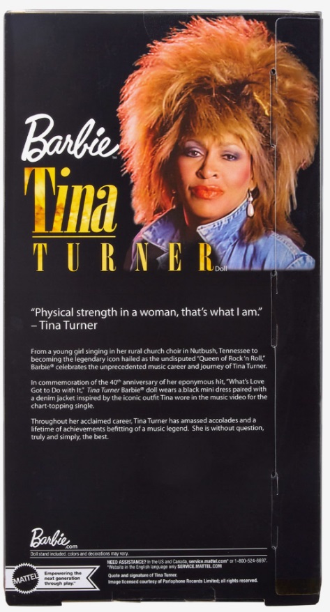 Юной девушкой она пела в сельском церковном хоре в Натбуше, штат Теннесси, и превратилась в легендарную исполнительницу, которую называют бесспорной “королевой рок-н-ролла”. Барби прославляет беспрецедентную музыкальную карьеру и жизненный путь Тины Тернер. Она обладательница "Грэмми", певица, возглавляющая чарты, и одна из самых продаваемых исполнительниц всех времен. Эта кукла посвящена ее популярному хиту “При чем тут любовь?”, а дизайн вдохновлен культовым нарядом, который Тина носила в музыкальном клипе.