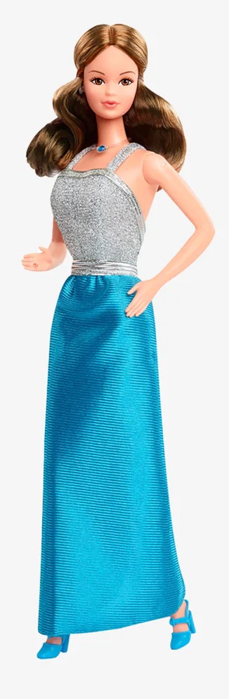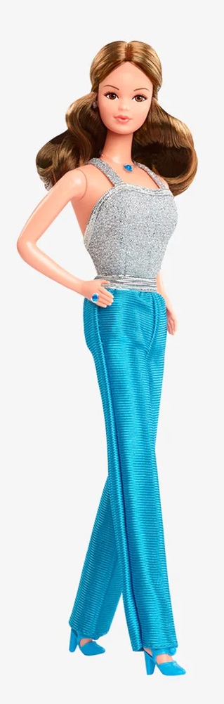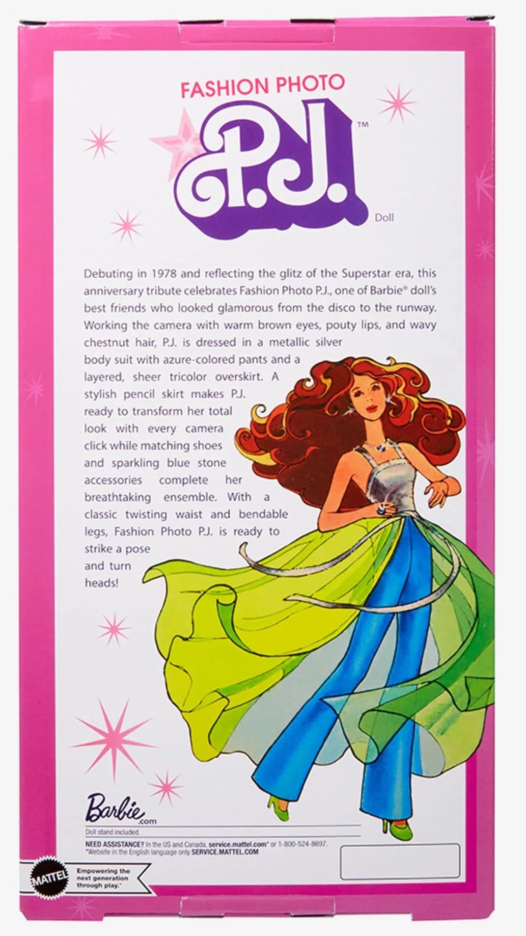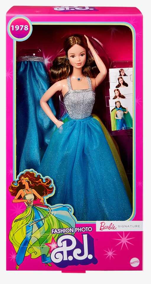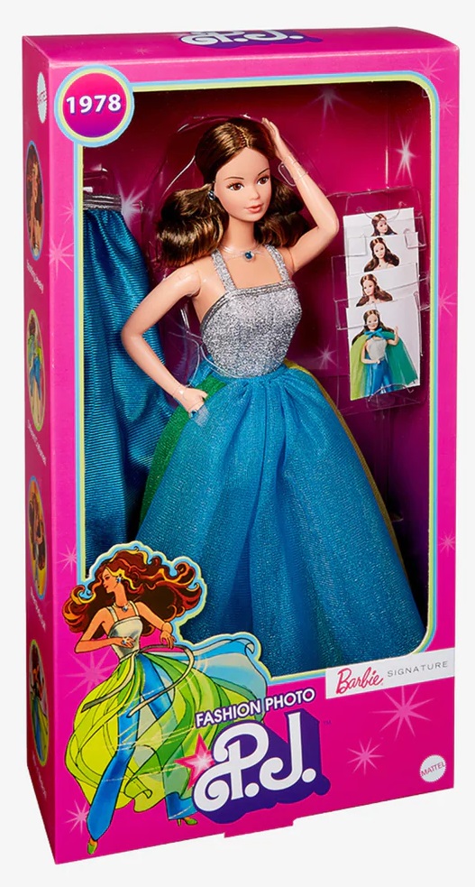 Мы очарованы нашей модной фотографией куклы Барби Пи Джей. Дебютировав в 1978 году, Пи Джей блистала от дискотеки до фотосессии. Для этой коллекционной репродукции, посвященной 45-летию, фэшн-фотомодель Пи Джей одета в облегающий костюм серебристого цвета с лазурными брюками и многослойной прозрачной верхней юбкой трехцветного цвета, а также в комплекте с двумя дополнительными юбками. Обладая классической округлой талией и гибкими ногами, фэшн-фотомодель Пи Джей готова принять позу и обратить на себя внимание.