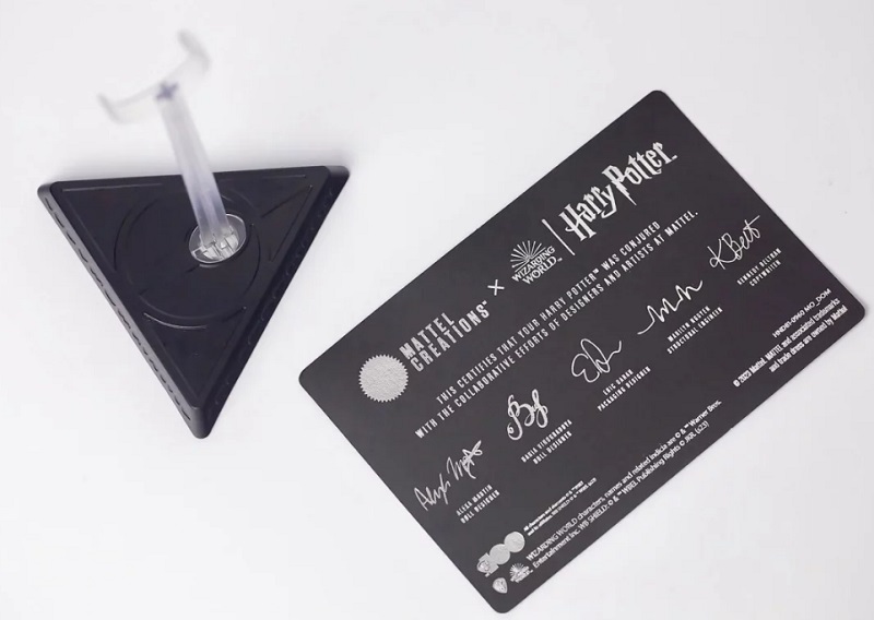 Сертификат выполнен в стильном черном цвете, на приятной на ощупь бумаге, а на обратной стороне есть список мастеров Mattel Creations, которые работали над куклой, а также их личные подписи. Такой сертификат действительно хочется с гордостью хранить на видном месте. Подставка также имеет аутентичный вид волшебного треугольника и оказалась очень удобной.
