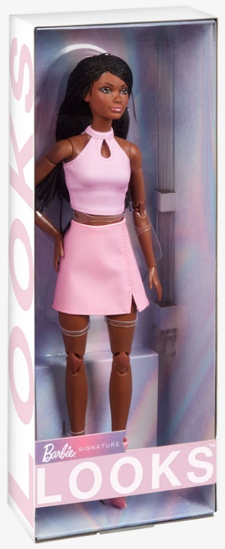 Вдохновляясь стилем 90-х, а также современными модными тенденциями, четвертая волна кукол Барби Лукс демонстрирует модные образы с деталями, достойными фото. Лицо куклы Барби, представленной под номером 21 в серии, обрамлено красивыми черными косичками. На ней топ на бретелях нежно-розового цвета с каплевидным вырезом. Юбка из искусственной лакированной кожи и сапоги на каблуках в тон дополняют образ блестящими деталями.