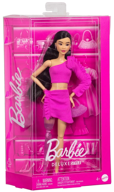 У этой куклы, одетой в фирменный розовый цвет, гладкие черные волосы и ярко-розовый протез на шарнирах!
