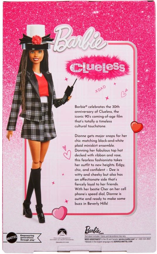 Барби празднует 30-летие комедии "Бестолковые", выпустив эту куклу Дионн. Она завоевала множество поклонников благодаря своему шикарному костюму в черно-белую клетку и культовому цилиндру. Она умело дополнила свой образ черными гольфами до колен и черными туфлями на платформе в тон. С мобильным телефоном в руке и "подружкой Шер" на быстром наборе Дионн готова ко всему, что принесет день, – к роли свахи, походу по торговому центру или шумной прогулке по Беверли-Хиллз.