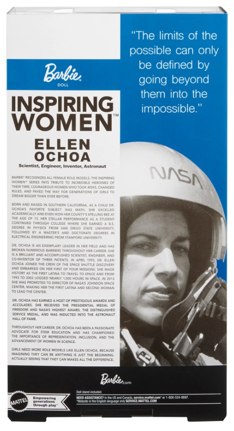 Серия "Вдохновляющие женщины" приветствует и чествует американского астронавта доктора Эллен Очоа. Эта выдающаяся ученая — одна из первых женщин в мире: студентка колледжа в первом поколении, первая латиноамериканка, побывавшая в космосе, и первый испаноязычный директор Космического центра Джонсона. Этот выдающийся физик и изобретатель провела в космосе более 41 дня, за плечами у нее множество медалей и патентов, и теперь она присоединилась к нашей линейке невероятных женщин Барби, которые вдохновляют девушек по всему миру.