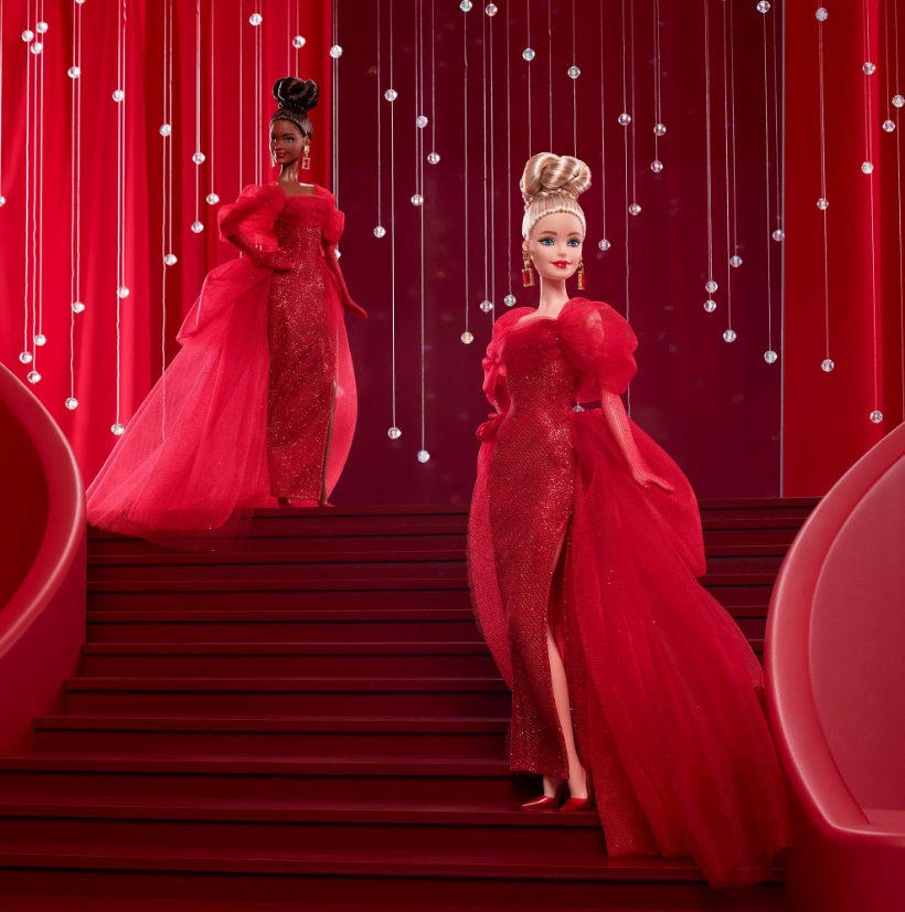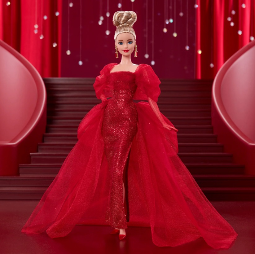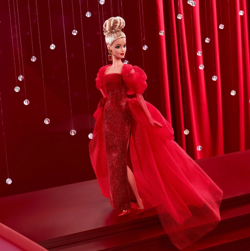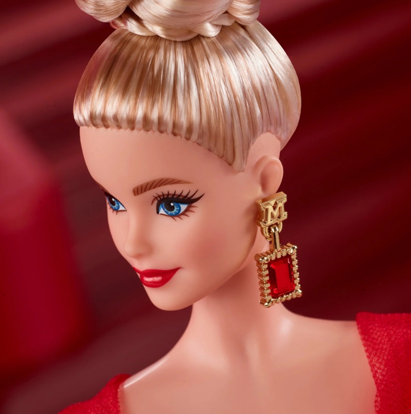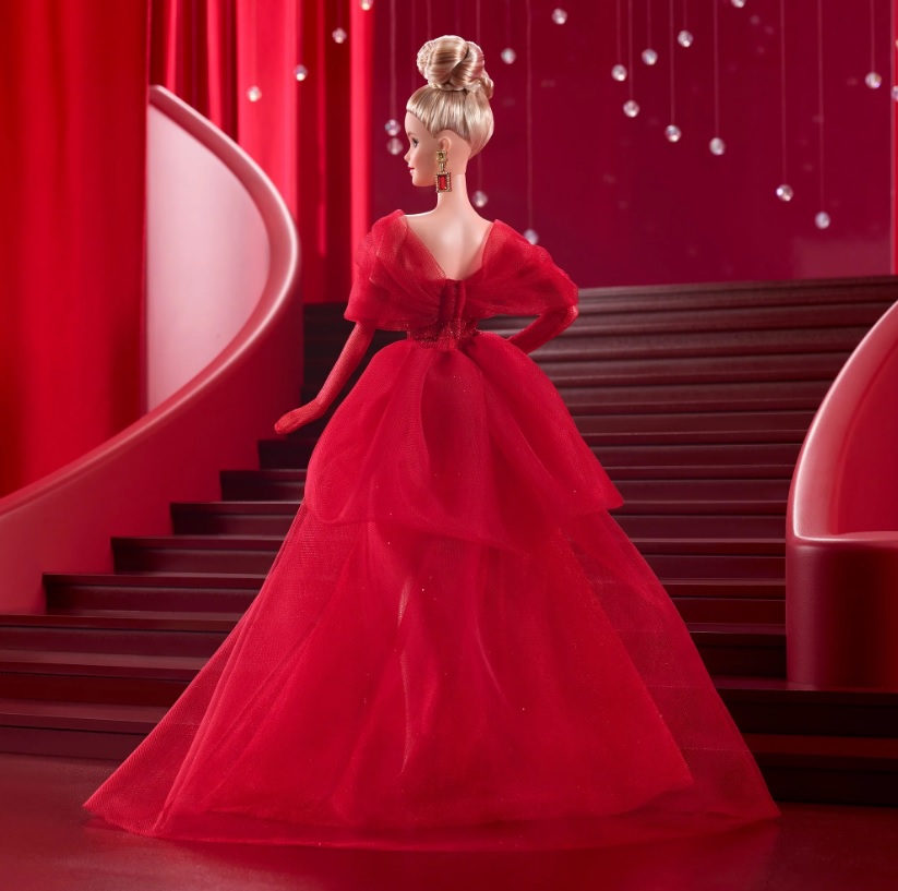 Эта кукла словно сошла с красной дорожки: её платье украшено блестящими рукавами-бантиками и эффектной отделкой из тюля. Ослепительный образ дополняют рубиновые туфли-лодочки, а красные ногти и серьги-капли с золотой буквой «М» напоминают о старом логотипе Matty Mattel.