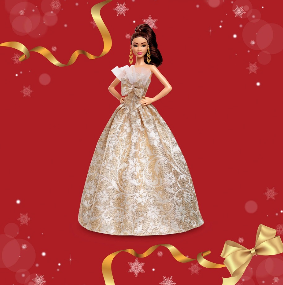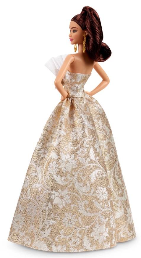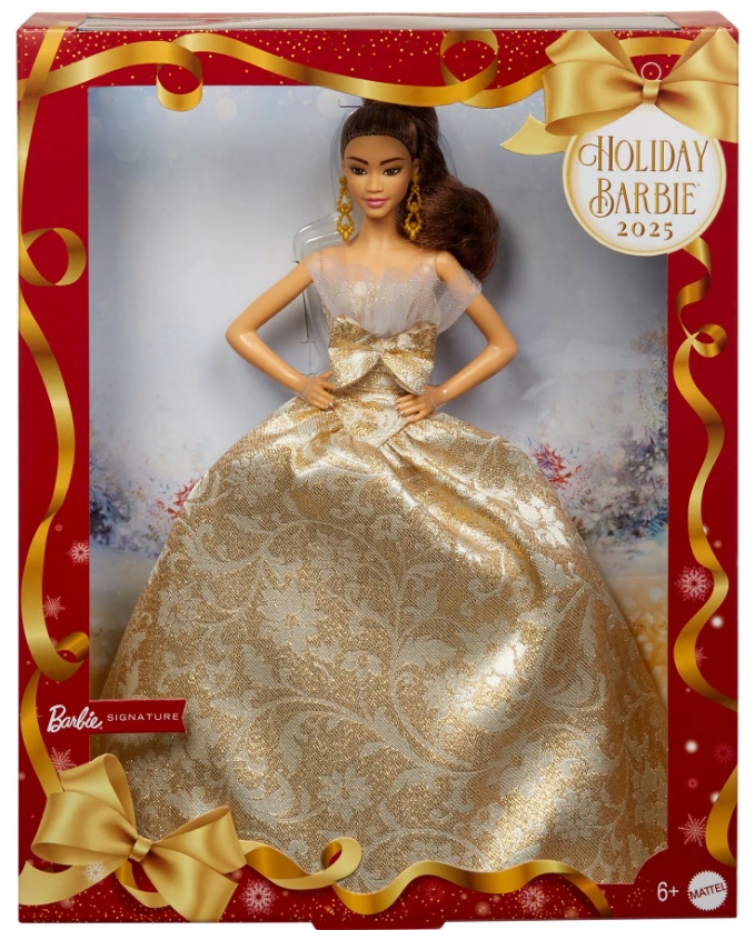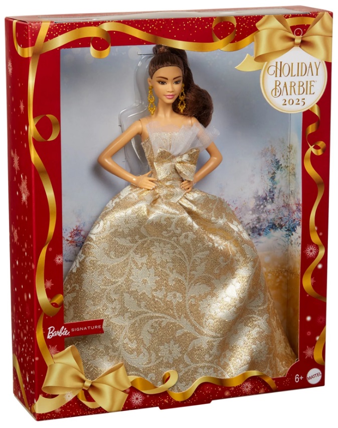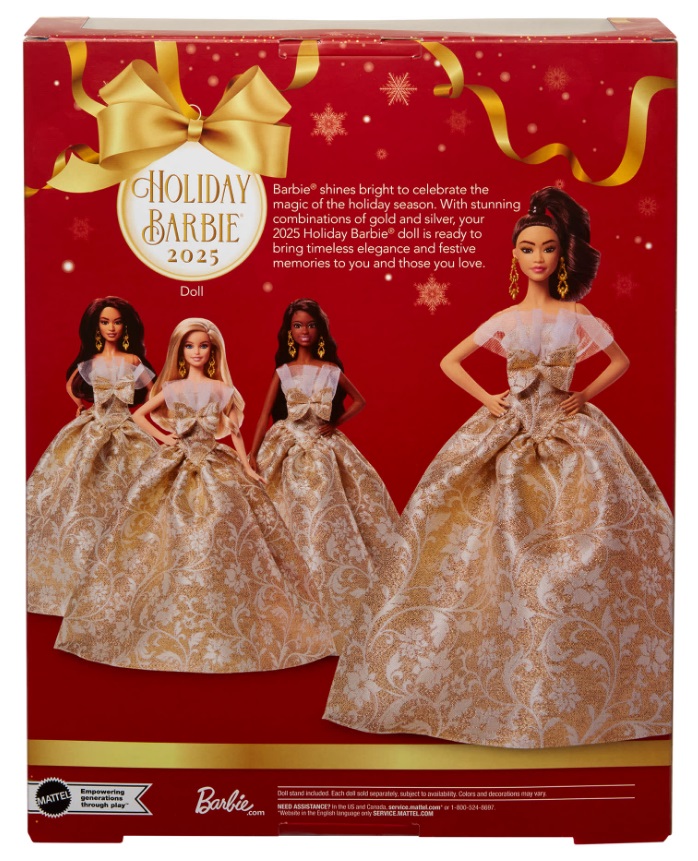 Праздничная кукла Barbie 2025 года готова принять все прелести модного сезона. Для праздничного времяпрепровождения она одета в пышное платье из серебряной и золотой парчи – дань уважения праздничному декору. Платье украшено гламурными деталями, в том числе эффектным вырезом, украшенным тюлем, и объемным бантом, дополненным каскадными золотыми серьгами и мюлями в тон. В упаковке, которая идеально подходит для демонстрации, эта кукла станет прекрасным дополнением к коллекциям или спискам праздничных пожеланий.