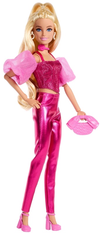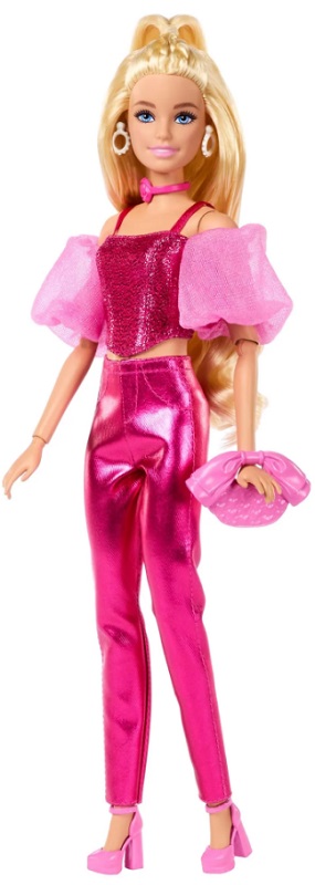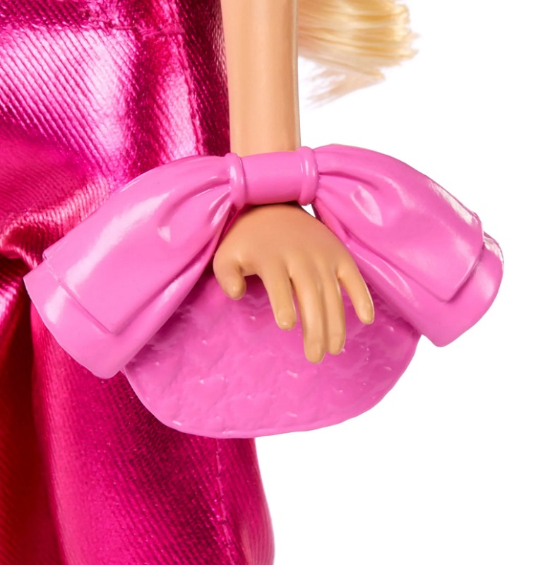 Эта кукла Барби с головы до ног одета в розовый наряд! Ее блестящий корсетный топ с металлическим отливом дополнен легкими, как воздух, рукавами из органзы, которые, кажется, "парят" над ее плечами.