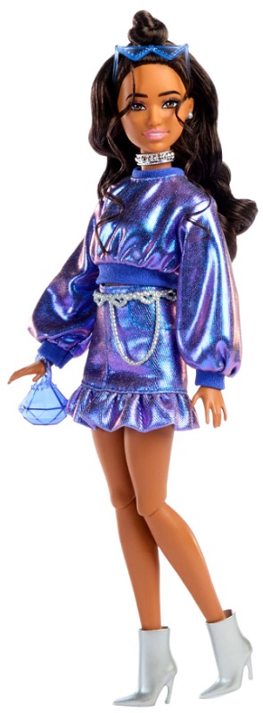 Эта кукла в металлическом наряде с блестящими деталями. Ее ледяной голубой укороченный свитер прекрасно сочетается с юбкой с воланами.