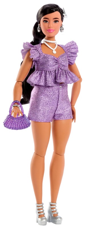 Эти куклы в роскошном стиле Барби поднимают "гламур" в совершенно новую стратосферу благодаря ослепительным нарядам и аксессуарам нового уровня, вдохновленным эстетикой металла! Эта кукла Барби сияет, как драгоценный камень в своем наряде аметистового цвета! Ее блестящий комплект состоит из топа с оборками и шортиков, сшитых на заказ.