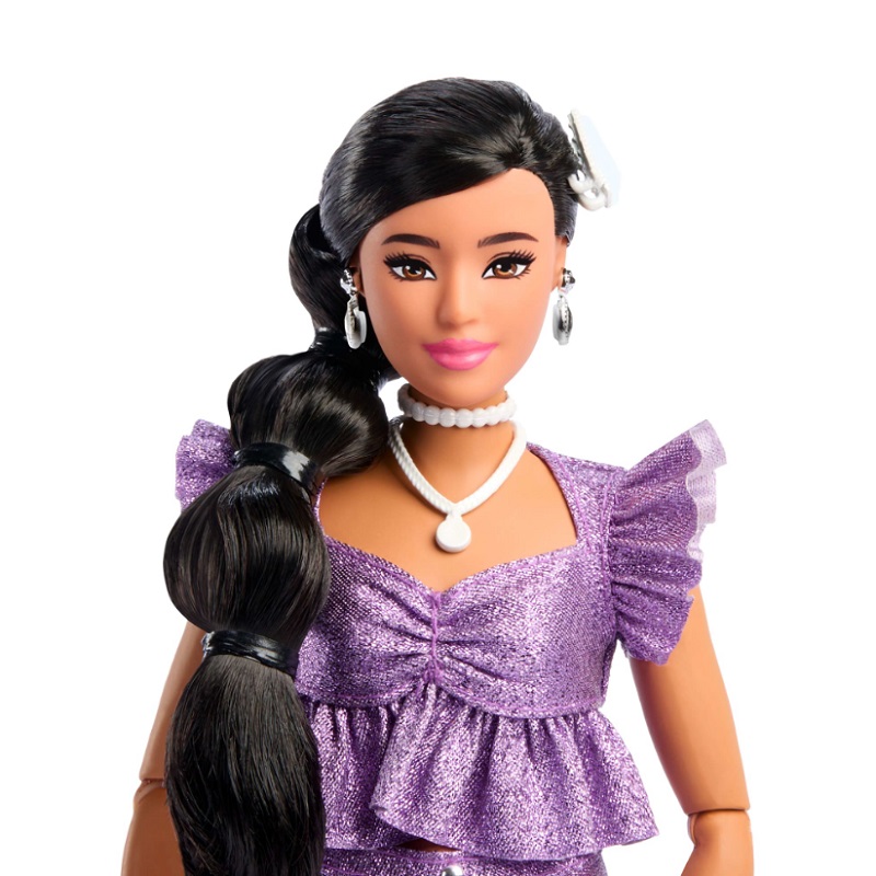 У нее соблазнительное телосложение и черные волосы, заплетенные в пышную косу. Белая заколка, висячие серьги и колье дополняют ее образ! Образ Барби дополнен сумочкой, украшенной бисером и туфлями на каблуках с серебряным ремешком. Подвижные суставы позволяют ей принимать самые разные позы!
