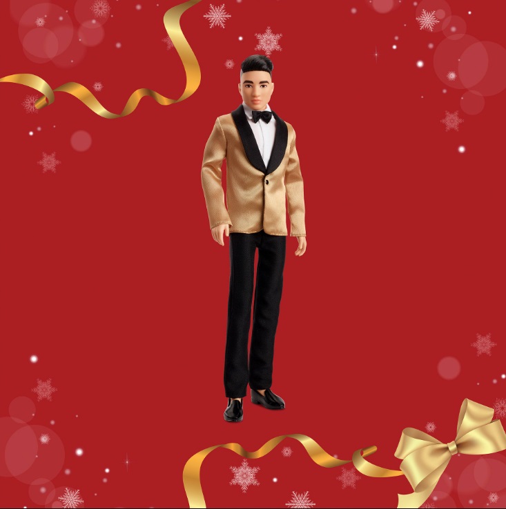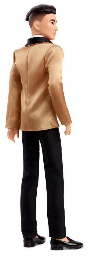 Кен из Праздничной коллекции одет и готов к сенсационному торжеству с куклой Барби. В своем премьерном показе в любимой праздничной коллекции Кен выглядит элегантно в роскошном золотистом атласном пиджаке-смокинге с шалевым воротником, черных брюках, черных мокасинах и галстуке-бабочке, завершающем образ. Созданный в дополнение к золотистым тонам праздничного блестящего платья куклы Барби, он является прекрасным дополнением к ежегодной традиции и незаменим для коллекционеров, которые хотят немного взбодриться в этот праздничный сезон.
