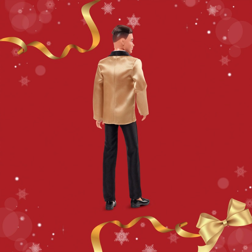 Кен из Праздничной коллекции одет и готов к сенсационному торжеству с куклой Барби. В своем премьерном показе в любимой праздничной коллекции Кен выглядит элегантно в роскошном золотистом атласном пиджаке-смокинге с шалевым воротником, черных брюках, черных мокасинах и галстуке-бабочке, завершающем образ. Созданный в дополнение к золотистым тонам праздничного блестящего платья куклы Барби, он является прекрасным дополнением к ежегодной традиции и незаменим для коллекционеров, которые хотят немного взбодриться в этот праздничный сезон.