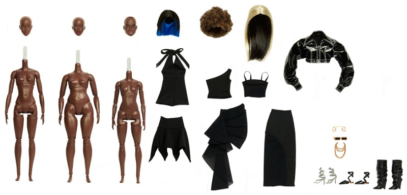 В комплекте: 3 тела, три головы, 3 парика, 3 топа, 3 юбки, куртка, босоножки 2 пары, сапоги, серьги, колье,, очки, упаковка