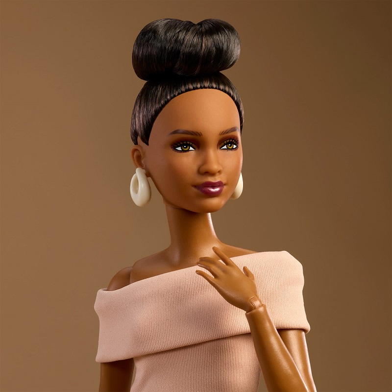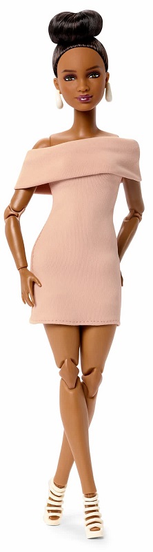 Базовая Барби (нейтральный цвет) №8 демонстрирует шикарный минимализм в элегантном коричневом платье с эффектным вырезом и кремовых туфлях на каблуках с ремешками. Ее темные волосы, уложенные в высокую прическу, подчеркивают массивные кремовые серьги.