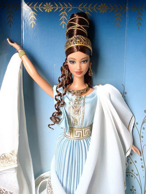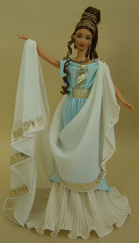 Римляне называли ее Венерой. Греки называли ее Афродита. Но любое упоминание о ней так или иначе связано с мифами и легендами. На кукле надето необыкновенное небесно-голубое платье из крепа и удивительная тога цвета слоновой кости с золотым орнаментом на древнегреческие мотивы.