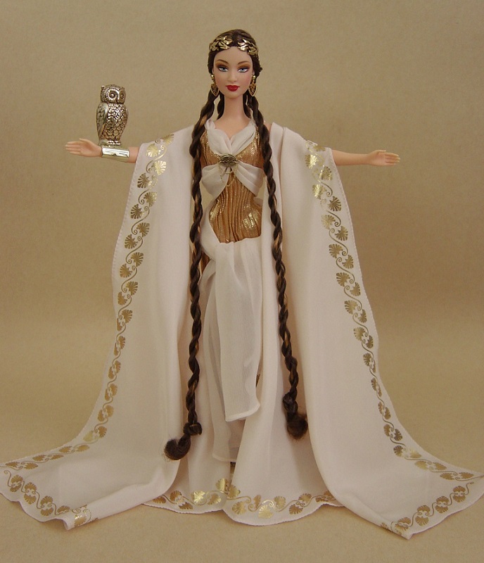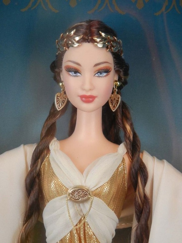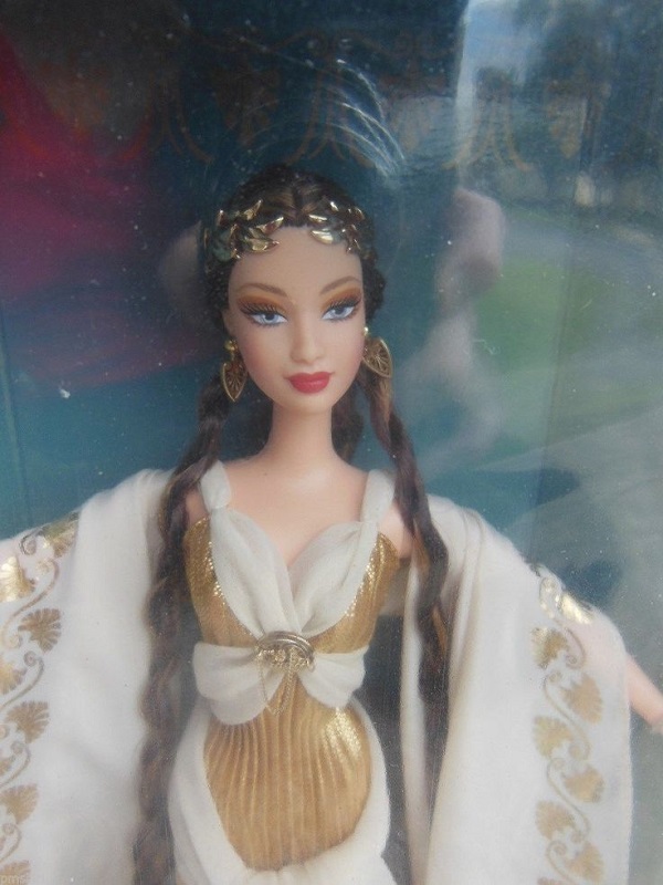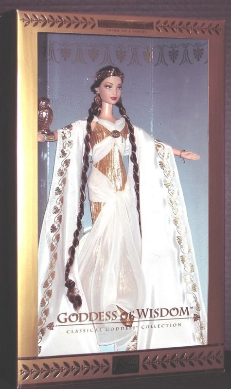 Барби Богиня мудрости своим великолепным видом отправляет нас в мифическую эпоху. Ее плиссированное платье из золотой ткани задрапировано шифоном цвета слоновой кости, лиф подчеркнут сверкающим золотым медальоном.