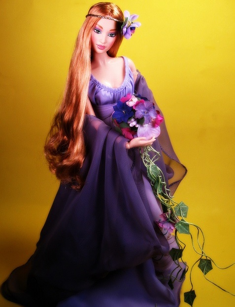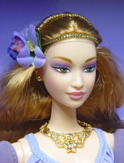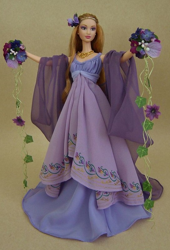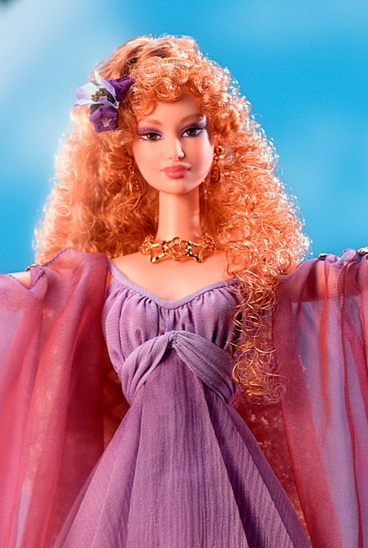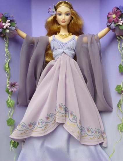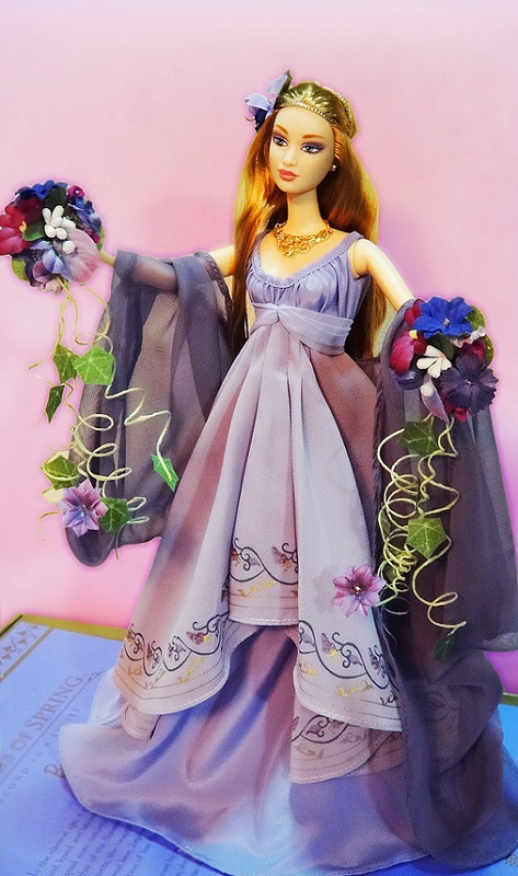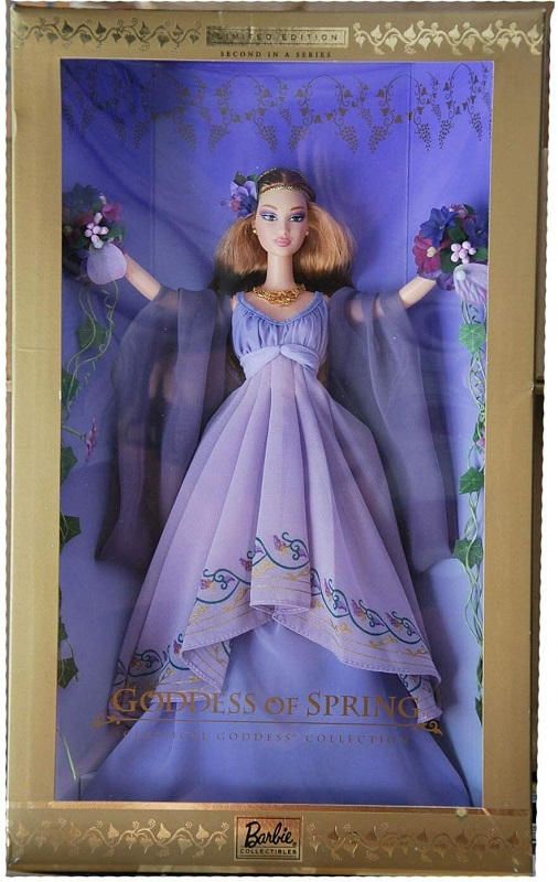 Барби богиня Весны – коллекционная кукла Барби, созданная по мотивам Древнегреческой и Римской мифологии. Богиня Весны разбудит природу от зимнего сна и подарит миру солнце и тепло. Роскошный наряд в лиловой гамме потрясает воображение – платье в стиле ампир, сшитое из крепа, верхняя юбка которого выполнена из материала жоржет и украшена интересным орнаментом, ниспадающие широкие рукава. Светлые вьющиеся волосы и притягательные черты лица куклы притягивают вгзляд. В руках красавица Барби держит яркие букеты цветов – напоминание о весне и лете. Кукла Барби Богиня Весны несомненно достойна Олимпа и ей не составит труда украсить любую коллекцию кукол!
